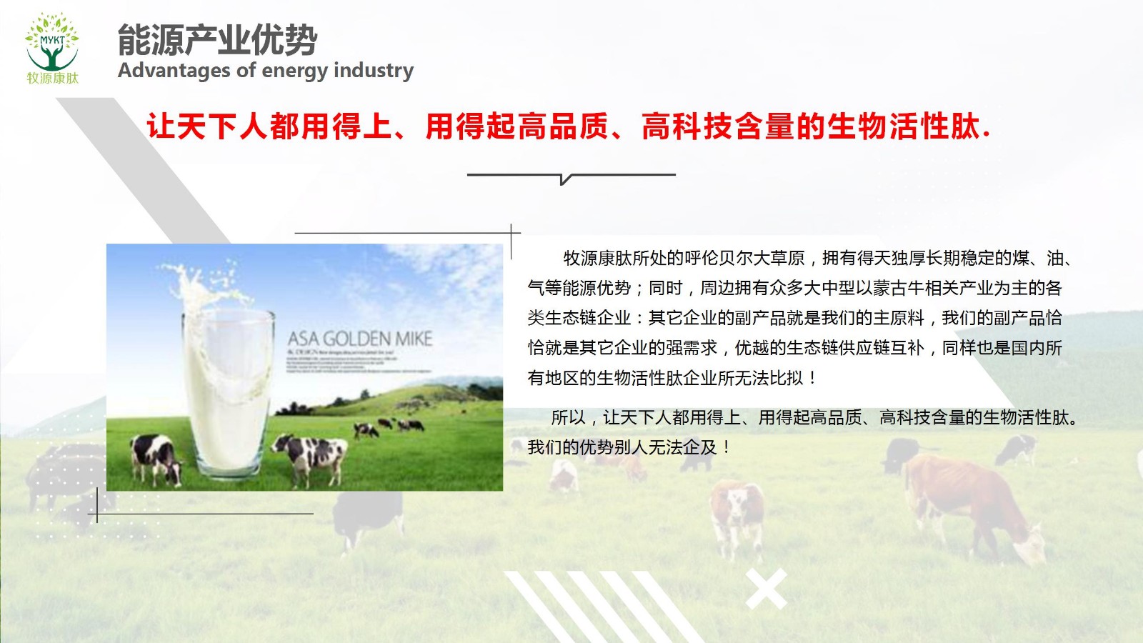 摘要:讓天下人都用得上、用得起高品質(zhì)、高科技含量的生物活性肽.牧源康肽所處的呼倫貝爾大草原,擁有得天獨(dú)厚長(zhǎng)期穩(wěn)定的煤、油、氣等能源優(yōu)勢(shì);同時(shí),周邊擁有眾多大中型以蒙古牛相關(guān)產(chǎn)業(yè)為主的各類生態(tài)鏈企業(yè):其它企業(yè)的副產(chǎn)品就是我們的主原料,我們的副產(chǎn)品恰...